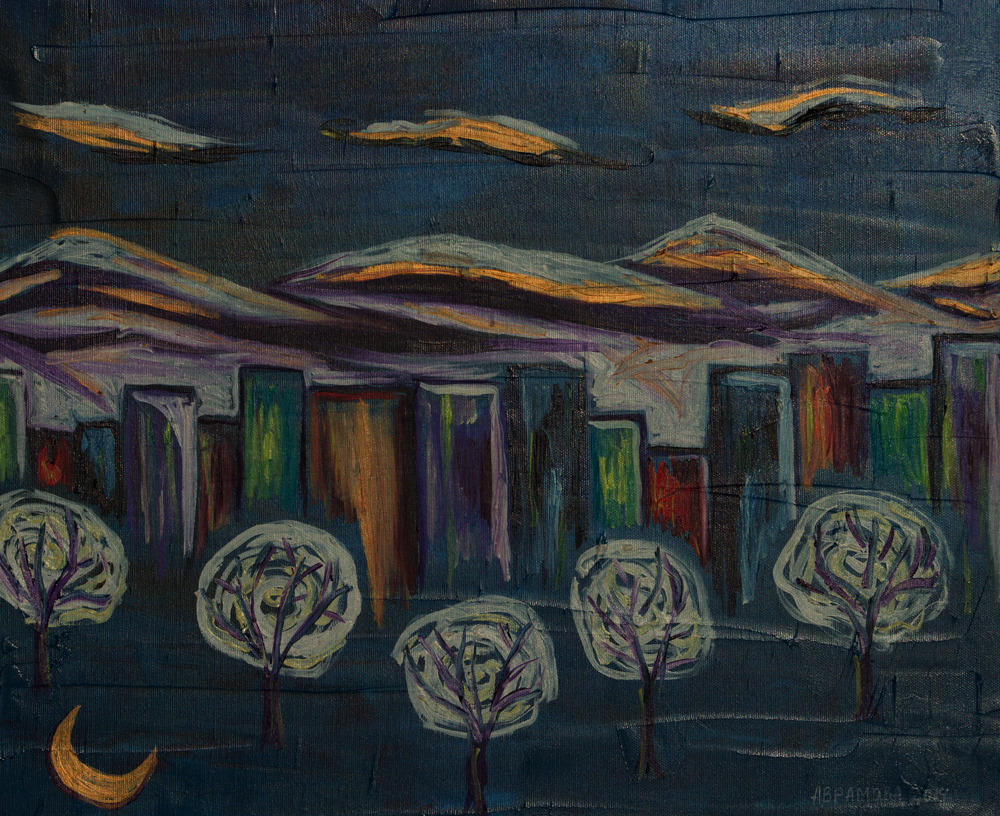 Град в облаци - нощ - е поредната картина от младия художник Тони Аврамова от град Пловдив. В тази картина преобладават тъмните тонове, а самата композиция е аналог на картината "Град в облаци - ден", с единствената разлика че тук е изобразена тъмната част от денонощието - нощта. Подобно на своя аналог, и тази картина внушава усещането за спокойствие и душевен мир. И тук е изобразена планина, пред която са подредени блокове, а на преден план младият автор е изобразил дървета. И тук няма изградена градска инфраструктура - липсват улици, кръстовища и тротоари. Дърветата обаче са много по-различни от аналогичната картина - "Град в облаци - ден"! Тук дърветата имат кръгли корони, всички са оцветени в един и същи цвят и от всяка корона като че ли се излъчва особено сияние. Авангардно решение е това Луната да се разположи не на небето, а върху Земята, в долния ляв ъгъл на картината. Както неведнъж е ставало въпрос, Тони Аврамова е основоположник на сюрреалистичния постмодернизъм и авангардния утилитаризъм в България и по света, стил, наречен накратко Аврамовизъм. Характерна за този стил е вътрешната одухотвореност на всяка една картина, собственото духовно излъчване на всеки един елемент и трансформациите на тази духовност в различни нейни форми по време на творческия процес на Тони Аврамова. За картината "Град в облаци - нощ" тези тендеции са изразени в особено силна степен - всяко дърво излъчва свое собствено сияние; Луната като че ли осветява облаците отдолу нагоре, а самите облаци отразяват светлината и я насочват надолу към планината. Поради това и върху планината се откриват ивици с жълтеникав цвят - тези ивици придават триизмерност и обем на планината, което създава дълбочина в цялата композиция. При внимателно наблюдение се открива още една разлика в сравнение с картината "Град в облаци - ден" - зад градския пейзаж се вижда една открита площ, подобна на поле, което се простира до подножието на планината. Това поле е оцветено в много бледо синьо - цвят, характерен за лунните нощи, когато лунната светлина осветява всичко в такива сумрачни цветове. На какво се дължи тази разлика? Причината за нея е очевидна - просто един и същи пейзаж се гледа от различни гледни точки. През нощта душата на човека се извисява нагоре, в резултат на което погледът е от по-високо. Поради това и сградите изглеждат по-ниски, а планината се открива в по-разширен вид; вижда се и въпросното поле, което при поглед от по-ниска гледна точка се прикрива от сградите. Разликата се дължи и на това, че през деня хората са по-земни, по-прагматично ориентирани, докато през нощта се извисяват духовно над нещата и душите на някои от тях започват да пътуват в пространството и времето. Защо обаче дърветата са разместени и по-малко на брой, сравнено с дневния изглед? Вероятно те, подобно на ентите от "Властелина на Пръстените" на Дж.Р.Р. Толкин, имат способността да се движат и да се разместват. Това е наситено с много дълбока символика - ентите си бяха добри същества, които пазеха хората и белия свят от Тъмната страна и Злото! Ето нещо, свързано с посланието за мир на Тони Аврамова - има сили, които осъществяват протекция над хората и обществото, и когато е необходимо, се активират и прегрупират, за да защитят всички нас от злите сили. В картината "Град в облаци - нощ" тези сили са приведени в активно 