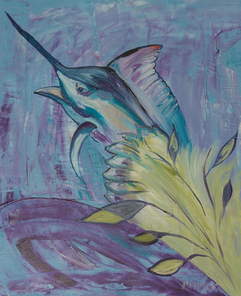 Син марлин - картина, нарисувана от художничката Тони Аврамова. Марлините (Istiophoridae) са семейство големи хищни соленоводни риби. Имат удължено тяло, което при по-големите видове може да надхвърли 4 метра дължина, заострена като копие муцуна и твърда дълга гръбна перка, която се увеличава в предната част, образувайки гребен. Една от най-големите и най-бързите риби в океана е синият марлин. Гърбът му е оцветен понякога в кобалтово синьо, а коремната им област – в сребристо бяло. Между мъжките и женските индивиди има изразен полов диморфизъм – женските са доста по-големи от мъжките. Дължината им достига 4.3 метра, а теглото им – до 900 кг, което ги прави суперриби в океана. Марлините са бързи плувци, срещат се във всички морета (с изключение на Мъртво море), и ловуват малки и големи риби. Най-много марлини обаче обитават водите на Атлантическия и Индийския океан. В Черно море се срещат марлини, но изключително рядко - понякога в периода на миграции на рибата паламуд са се придвижвали и екземпляри от вида марлин. Това се дължи на факта че марлините в най-общия случай предпочитат по-топли води, около тропиците; освен това марлинът предпочита да плува близо до повърхността, защото там водата също е по-топла. Марлините са много бързи и могат да преплуват 100 метра за 4 секунди. Мигрираща риба - може да преплува хиляди километри в следване на топлите океански течения. Те са популярни риби за спортен риболов в определени тропични области и са също ценени като храна. Повечето спортни рибари освобождават марлините, след като ги откачат от въдицата. Някои марлини, които имат рекордни размери за областта си, са взимани и измервани на брега. Тези рекорди са най-често записвани в книгите за спортен риболов. Женските хвърлят хайвера си около Куба, между май и ноември, поради което и много рибари специално пътуват до Острова на Свободата с цел улов на марлин. Продължителността на живота им е около 27 години. Синият марлин е риба, която предизвиква голям интерес у хората. За него пише Хемингуей в книгата си „Старецът и морето“. В Япония месото му е определяно като деликатес – от него се приготвя вид суши. Най-големият син марлин, улавян някога, е с тегло 636 килограма.