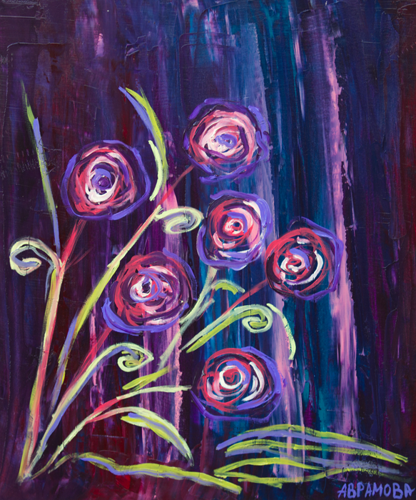 Нощни цветя - картина от младия художник Тони Аврамова от град Пловдив. В своето творчество Тони Аврамова предпочита основно по-светлите и по-свежи цветове; при тази картина обаче се е спряла на по-тъмен фон. Във всички нейни произведения фонът се характеризира с натрупвания и преливания на различни цветове; тази картина не прави изключение. Единствената разлика е че тук младият автор е използвал тъмносини, лилави и много тъмночервени цветове. Розовите ивици внасят свежест и разнообразие във фона; те символизират надеждата на всеки човек че след нощта идва ден, че след мрака идва светлина, благодарение на вечния кръговрат в природата. След мрака светлината е най-силна! Разбира се, в тази картина на Тони Аврамова няма усещане за мрак и безнадеждност - в нейното творчество такива мотиви няма да откриете, дори и да ги търсите под лупа седмици наред! Причина за тъмните тонове на картината "Нощни цветя" е желанието на авторката да създаде едно усещане за спокойствие и душевен мир, да пресъздаде релаксиращото въздействие на съня, от който всички ние така или иначе имаме нужда понякога. Цветята са стилизирани и имат абстрактна форма. Цветовете им са в хармония с цветовете на фона; единствено стъблата и равнинната структура в долния десен ъгъл на картината са оцветени в свежо зелено, поради което и създават усещане за настроение и позитивизъм. Този контраст между тъмния фон и светлите стъбла и листа на растящите цветя подсилва успокояващия ефект на картината! Както и в други успешни произведения на Тони Аврамова (да си припомним картината "Поезия от цветя") растенията не са разположени вертикално, а по диагонал - от долния ляв ъгъл в посока центъра на картината. Но, докато при "Поезия от Цветя" композицията създава усещане за динамика и движение, тук същото разположение на цветовете въздейства успокояващо. Как ли младият автор успява да постигне два коренно противоположни ефекта с едно и също разположение на сходни графични елементи??? Съвременната абстрактна живопис винаги създава такива загадки, някои от които остават в съзнанието на наблюдателя седмици наред и го карат да се замисля отново и отново относно това какво точно е искал да каже авторът с някоя своя творба? Очевидно тук успокояващото въздействие на композицията от цветя се дължи на тъмния фон, който създава усещане за нощен покой и релаксира съзнанието на всеки, който се вгледа в тази изумителна творба на съвременното изкуство.